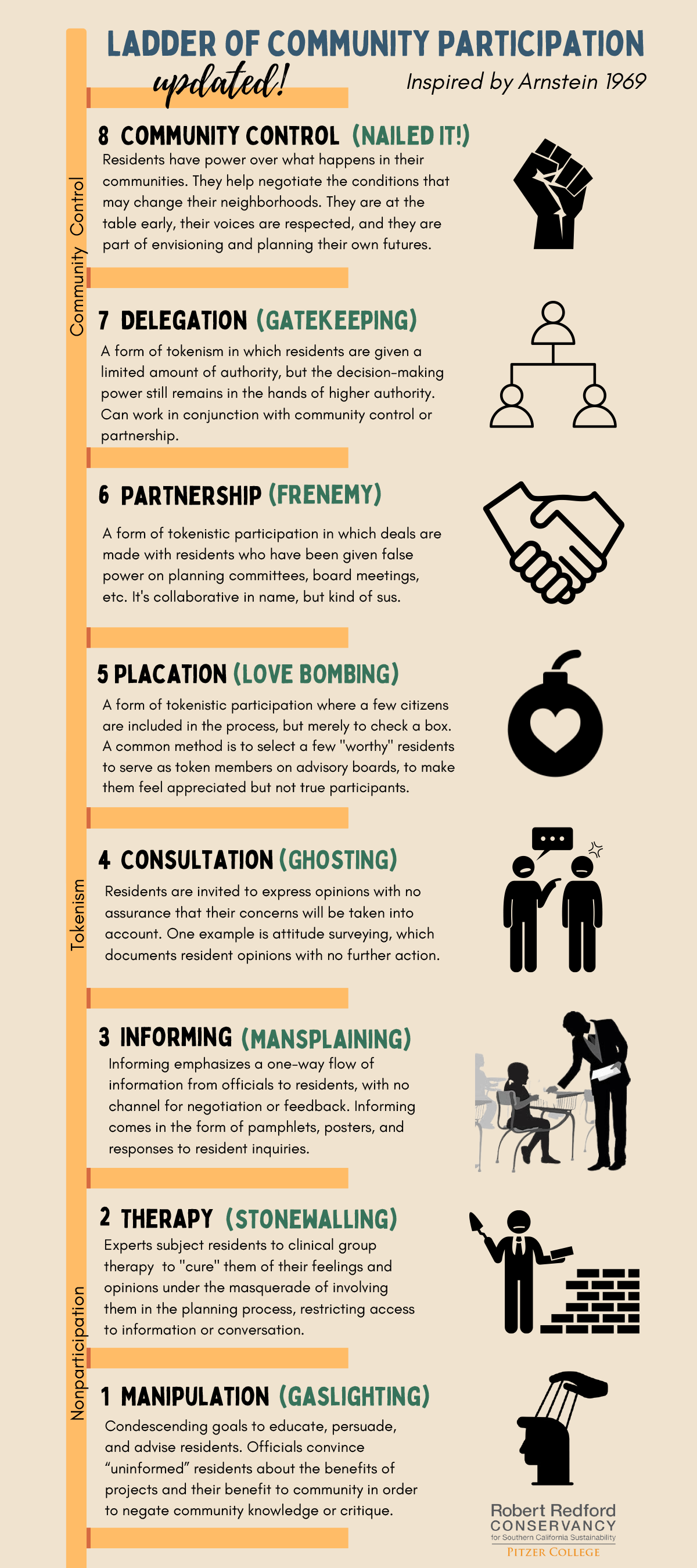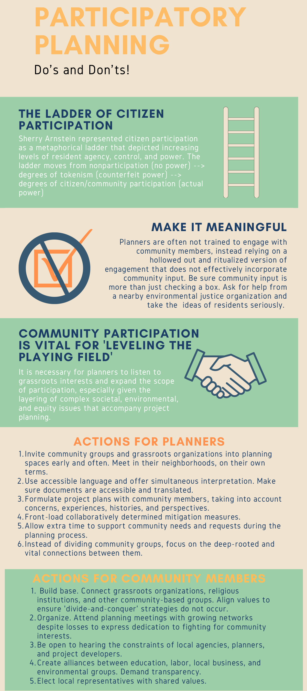 Decisions are made before public input stages/public input is ineffective. Cooption of community voice for project approval but no real or meaningful community engagement. Exclusion is cemented through inaccessible language.